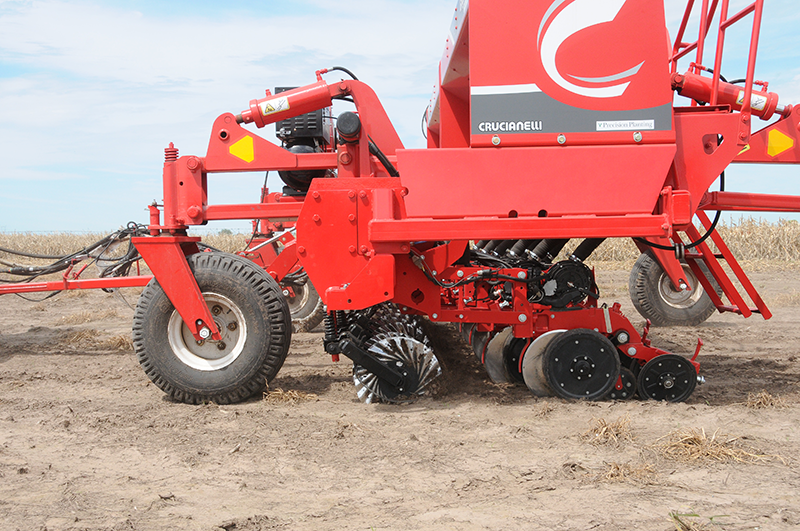 En la dinámica de siembra se presentaron muchos equipos que cubrieron toda la gama de necesidades de los productores. La sembradora Crucianelli con los sistemas de «Precision Plan-ting” se presentó con 10 surcadores a 52,5 cm y dosificación neumática. Requiere una potencia de 120 HP y su sistema de transporte es “de punta” con un ancho de 3,90 m.