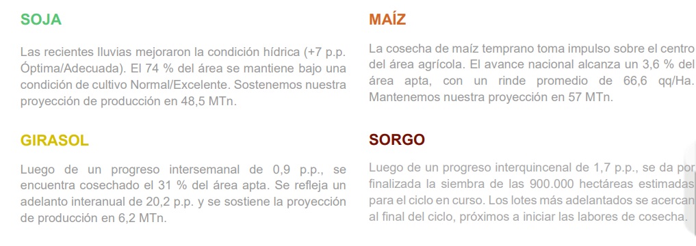 En cuanto al maíz tardío, se registra una mejora intersemanal de 6,6 p.p. en la condición hídrica, un cambio especialmente favorable considerando que a nivel nacional el 94,1 % de los planteos se encuentra desde panojamiento en adelante, etapa en la que la disponibilidad de agua resulta clave para transitar el período crítico. En este contexto, el 87,6 % del área relevada presenta una condición de cultivo que se ubica entre Normal y Excelente. Frente a este panorama, mantenemos nuestra proyección de 57 MTn.