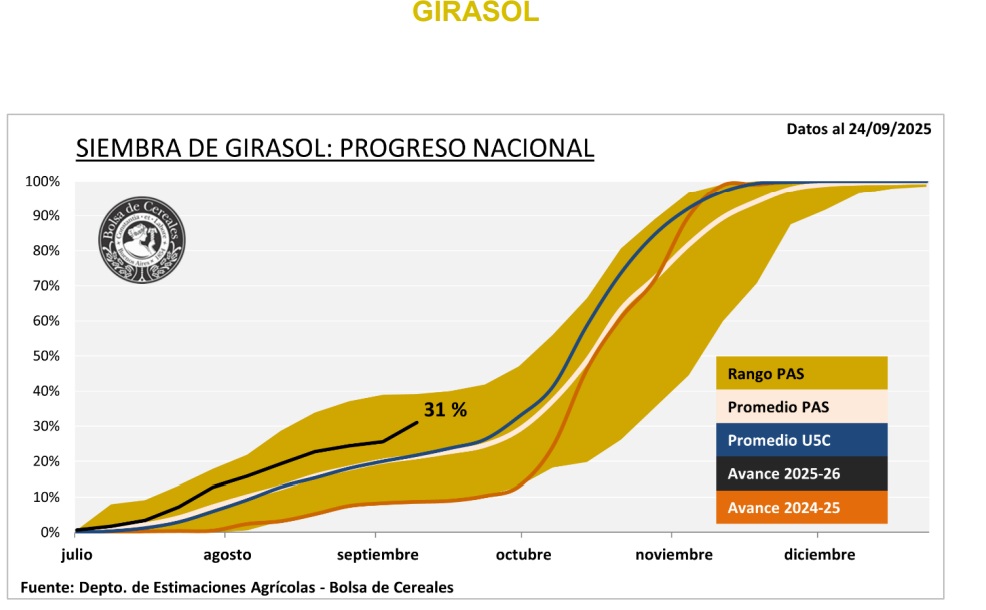En cuanto a la siembra de girasol, se registró un progreso intersemanal de 5,4 p.p., alcanzando el 31 % del área proyectada en 2,6 MHa para el ciclo en curso, registrando adelantos de 22 y 12,9 p.p. en comparación al ciclo previo y el último quinquenio, respectivamente.