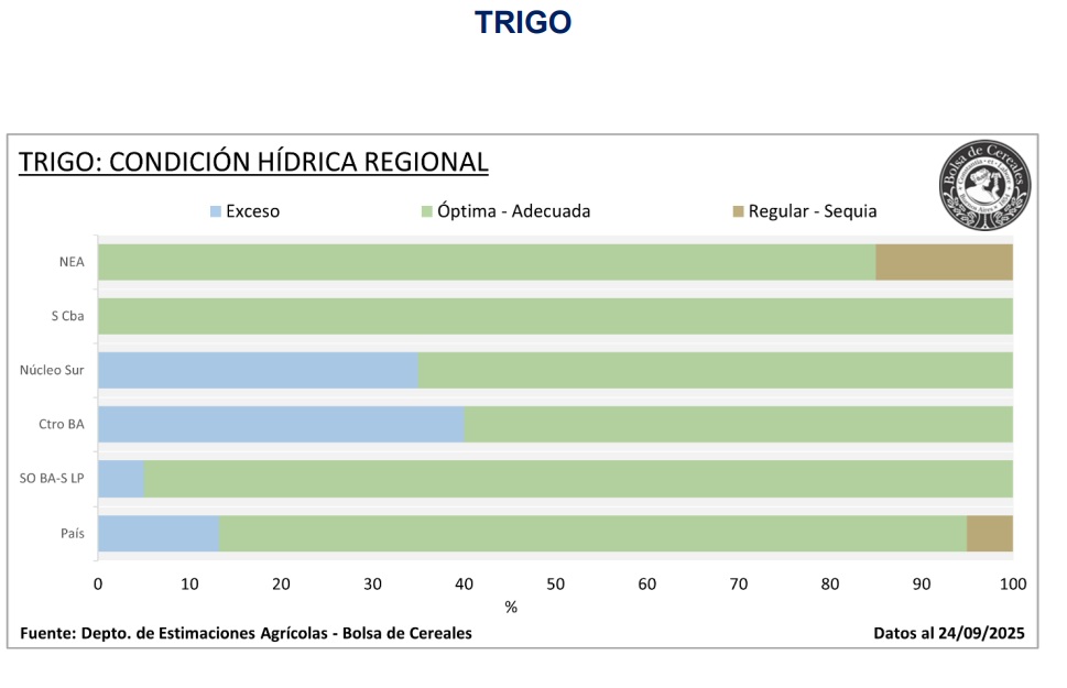Del área estimada en 6,7 MHa, el 70,9 % transita desde encañazón en adelante. El 81,7 % del cereal mantiene condición hídrica Adecuada/Óptima y el 96,9 % presenta condición de cultivo Normal/Excelente.