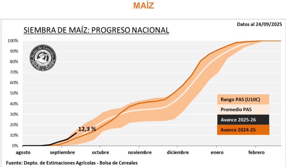 La siembra de maíz con destino grano avanzó satisfactoriamente registrando un progreso intersemanal de 6,1 puntos porcentuales alcanzando el 12,3 % del total estimado para esta campaña. En términos absolutos, se estima que ya se implantaron 1.000.000 de hectáreas frente a las 700.000 hectáreas que se habían sembrado a esta altura el año pasado.