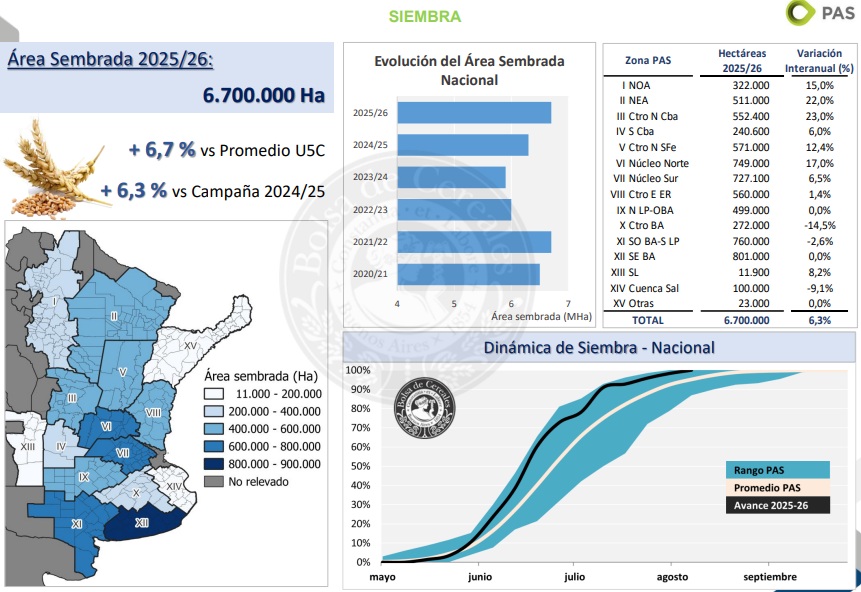 Se sembraron 6,7 MHa, un 6,3 % más que la campaña anterior y alcanzando nuevamente el máximo de la serie PAS. Las lluvias registradas durante la ventana de siembra dieron lugar a una importante expansión del área a sembrar, aunque algunos sectores bajo anegamientos no lograron cumplir los planes de siembra iniciales.