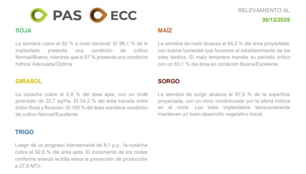El 96,1 % del área presenta una condición de cultivo Normal/Buena, mientras que el 97 % del área implantada registra una condición hídrica Adecuada/Óptima. En paralelo, el 17,3 % de la soja de primera ya transita estadios reproductivos, observándose un mayor desarrollo sobre ambos núcleos productivos y el Norte de La Pampa – Oeste de Buenos Aires, donde se espera el regreso de precipitaciones para afrontar la etapa de mayor demanda hídrica.