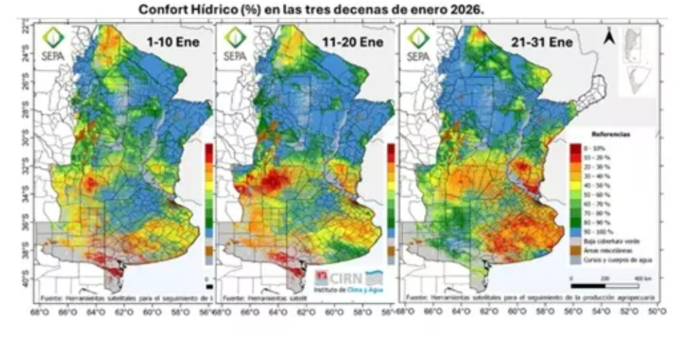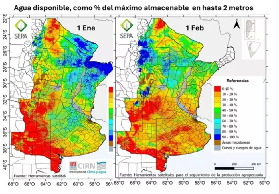 Para el balance hídrico que elabora SEPA, enero comenzó con más del 50 % de la capacidad de almacenamiento en buena parte de la Pampa Ondulada, la Pampa interior y, sobre todo, el norte del país, a excepción del noroeste. En cambio, el almacén habría estado más limitado en el oeste de la región Pampeana, partes del sur del litoral y gran parte de la Depresión del Salado y sur de Buenos Aires.