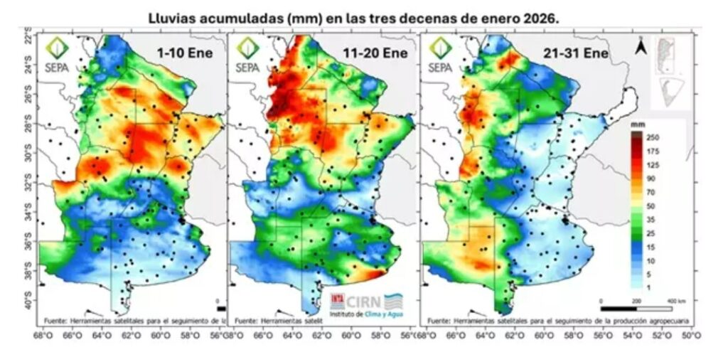 Enero 2026 no fue la excepción a ese marco agroclimático, pero las lluvias fueron dispares. En este sentido, Lucas Gusmerotti, del Instituto de Clima y Agua del INTA, afirmó: “En base a la estimación diaria de lluvias que realizan desde la plataforma SEPA se puede ver que, en la primera decena del mes, las lluvias se concentraron en el norte del área agrícola”.