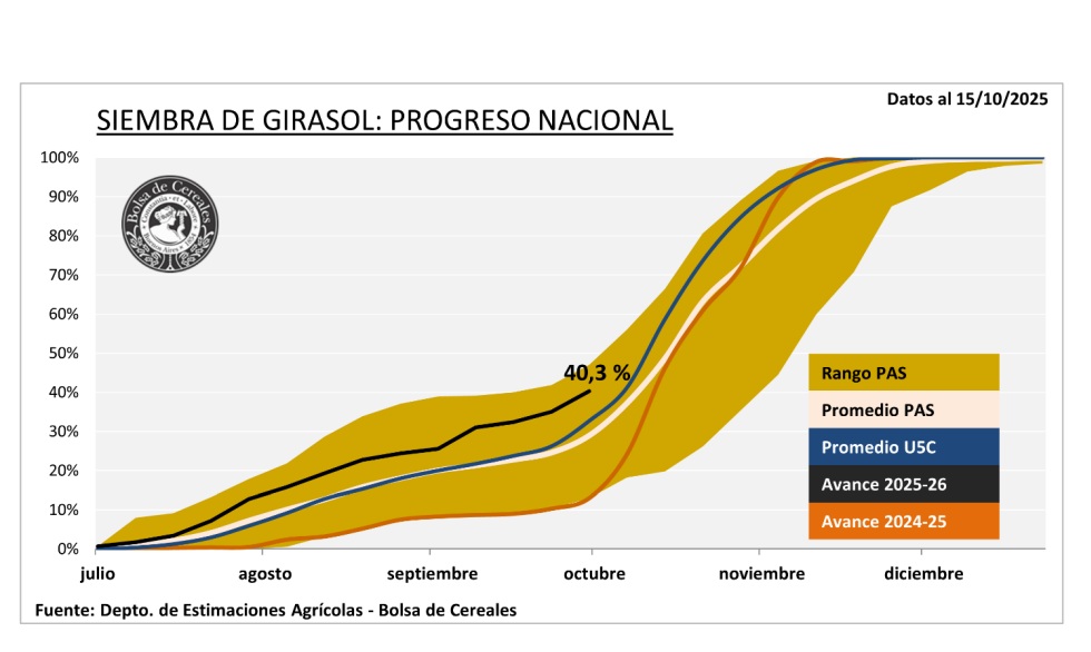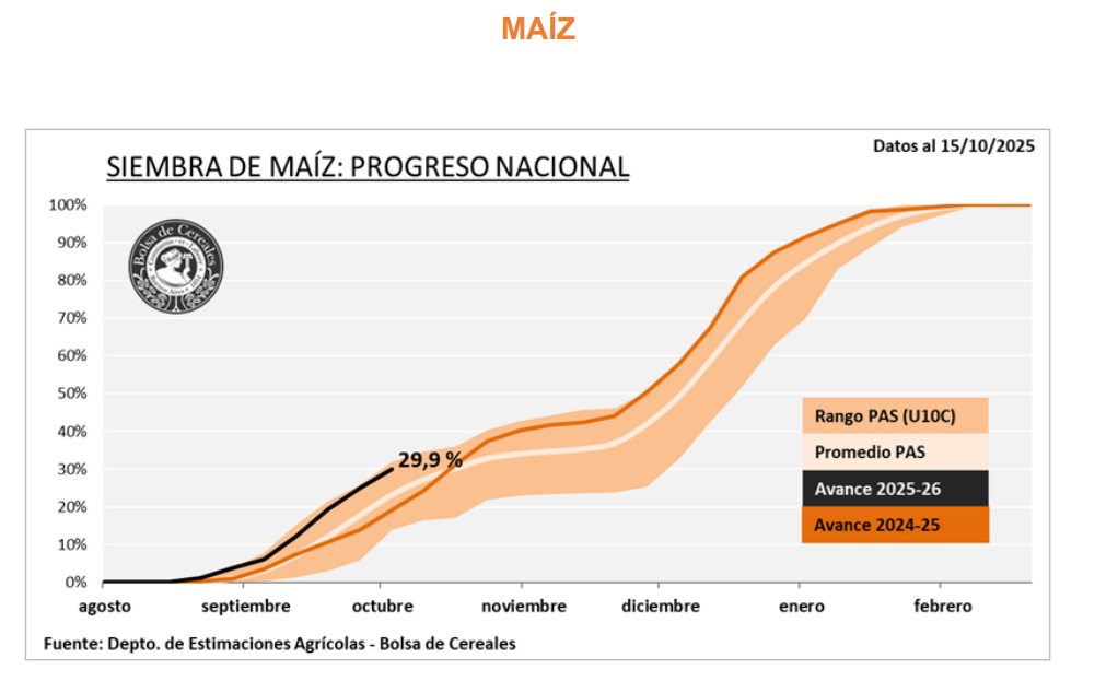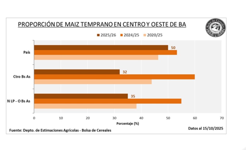 Como consecuencia de estas condiciones, se prevé que no se logren concretar los planes iniciales de siembra temprana. En este sentido, la participación de estos planteos en el total sembrado se ajusta a la baja: en el oeste de Buenos Aires, la estimación desciende del 44 % estimado en septiembre al 35 %, mientras que en el Centro de Buenos Aires cae del 59 % al 32 %. Por otro lado, en el centro del área agrícola, la siembra de maíz temprano se encuentra prácticamente finalizada, restando únicamente algunos lotes puntuales en la zona Núcleo y en Córdoba, cuya implantación se espera completar en los próximos días.