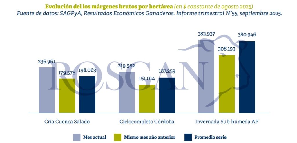 De igual modo, el modelo productivo que contempla un sistema de ciclo completo en el centro-sur de Córdoba ofrece actualmente un margen bruto de $219.582 por hectárea, lo que representa un 17% superior al promedio de la serie y un 45% más alto que en agosto de 2024.