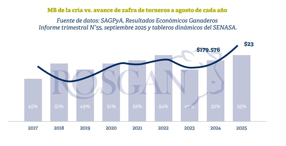En el caso de la cría, los márgenes calculados para una explotación de 450 hectáreas en la Cuenca del Salado, con una carga de 0,58 vientres por hectárea y un destete del 72%, arrojan para agosto unos $236.961 por hectárea, lo que representa un 20% más que el promedio de la serie y un 32% superior al margen estimado doce meses atrás.