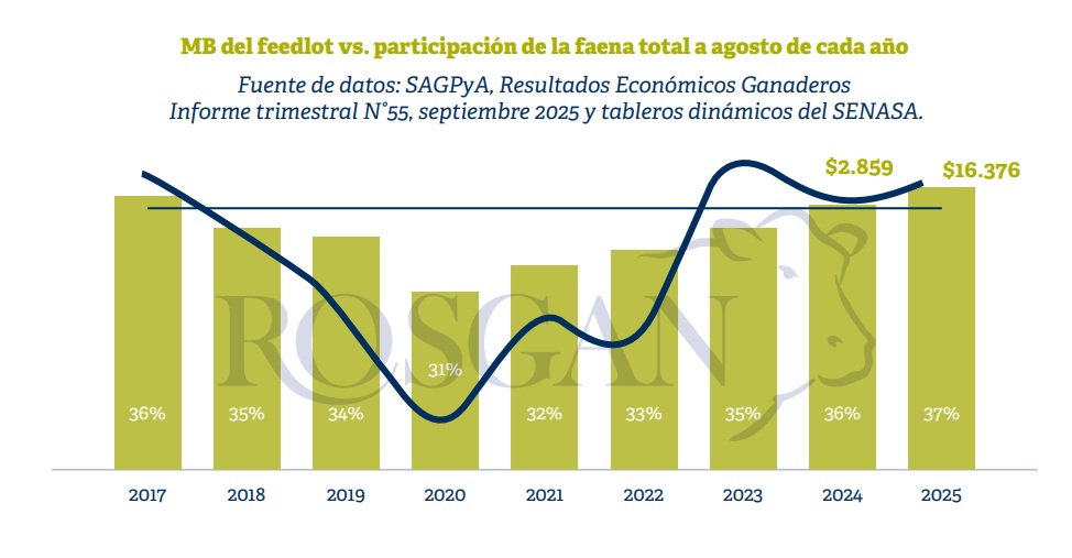 Este año, aunque el margen es ajustado —volviéndose negativo tras considerar el costo financiero de la actividad—, hasta agosto fue uno de los períodos más saludables para el feedlot, lo cual también se refleja en la participación de sus animales en la faena total