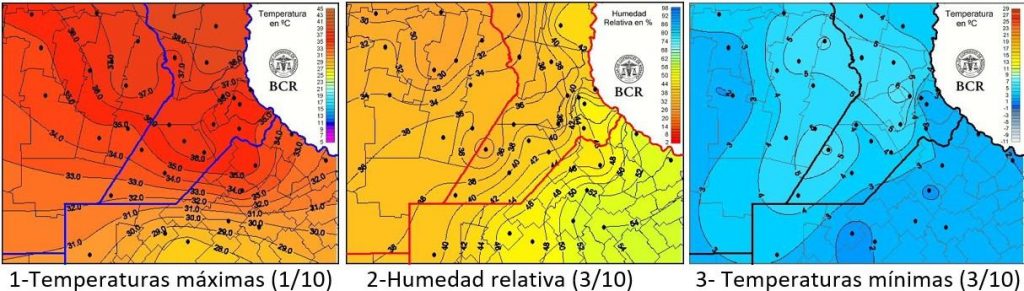 En la región núcleo, la media mensual de lluvias para setiembre es 50 mm, pero el promedio de lluvias de la red GEA/BCR fue de 0,8 mm. Lo habitual sería recibir unos 30 mm en el oeste y 70 milímetros en el este. Si bien la tormenta de Santa Rosa dejó lluvias importantes en el NE bonaerense, para el resto no ha habido lluvias significativas desde mediados de mayo. Para recomponer los niveles de humedad se necesitan entre 100 y 180 mm en las áreas más afectadas. Las lluvias normales de octubre deberían dejar 100 mm en la región, siguiendo las estadísticas. Para los 1ros 10 días del mes, por ejemplo, en Rosario deberían alcanzarse los 20 mm. Pero en el 2021 se registraron solo 2 mm; en el 2022, 5mm; y en el 2023, 2 mm.