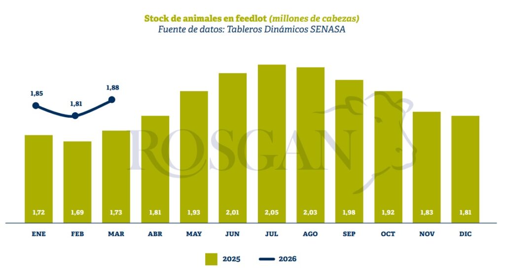 Según datos del SENASA, al 1° de marzo los feedlots reportaban 1,88 millones de cabezas, un 9% más que en 2025, cuando se había registrado otro récord histórico de 1,73 millones de cabezas para la misma fecha.
