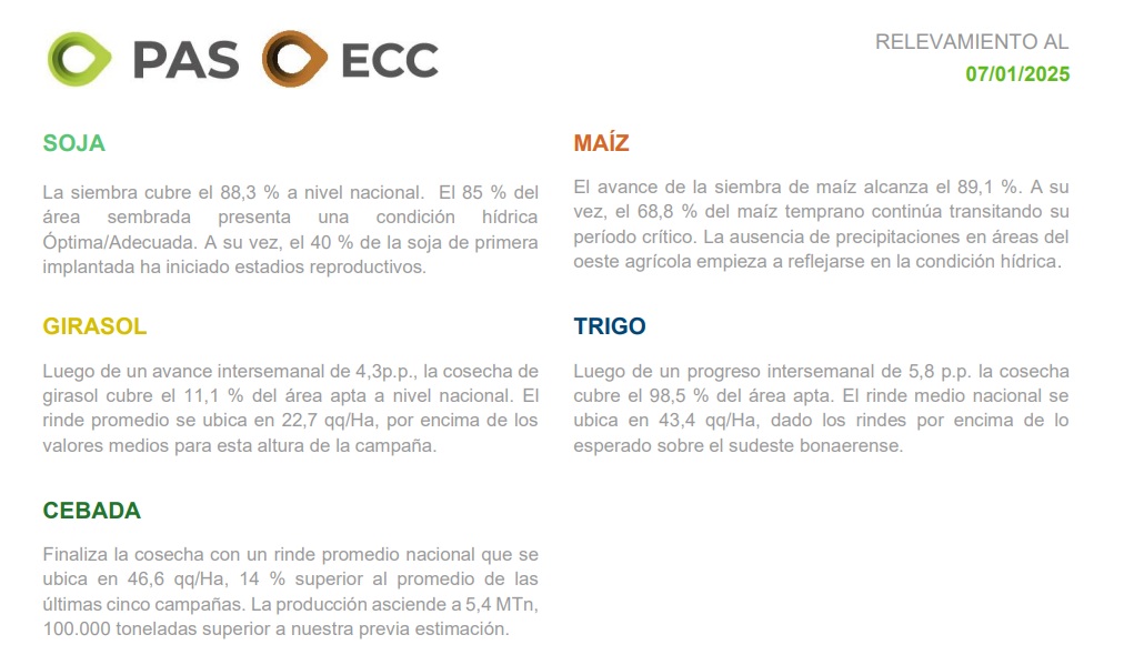 La siembra de maíz con destino a grano avanzó 4,8 p.p., alcanzando el 89,1 % del área nacional proyectada para la  campaña en curso, aunque con una demora interanual de –3,2 p.p. A nivel nacional, el maíz temprano continúa avanzando en su desarrollo, con el 68,8 % del área transitando el período crítico (VT–R1); asimismo, en el CentroEste de Entre Ríos, el 27 % del área relevada ya alcanza estadios de madurez fisiológica. Por otro lado, el maíz tardío avanza hacia el cierre de la siembra y los lotes implantados transitan los primeros estadios bajo condiciones generales adecuadas. Sin embargo, la falta de precipitaciones registrada en las últimas semanas en el Norte de La Pampa – Oeste de Buenos Aires ya se hace sentir en los cultivos, con los primeros signos de deterioro en la condición hídrica.