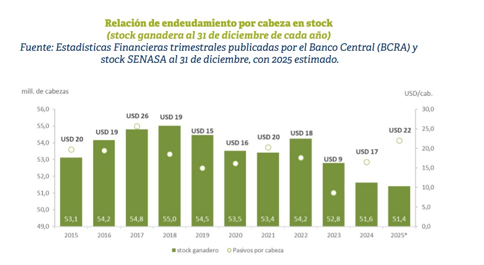 Realizando una valuación general de las distintas categorías que integran el stock ganadero al cierre de cada ciclo, se estima que a diciembre de 2025 el valor total de la hacienda en stock rondaba los USD 53.500 millones. Por su parte, de acuerdo con los reportes del BCRA, los saldos de préstamos adeudados por empresas ganaderas a entidades bancarias ascendían a USD 1.133 millones, lo que equivale a un nivel de apalancamiento del 2,1%.