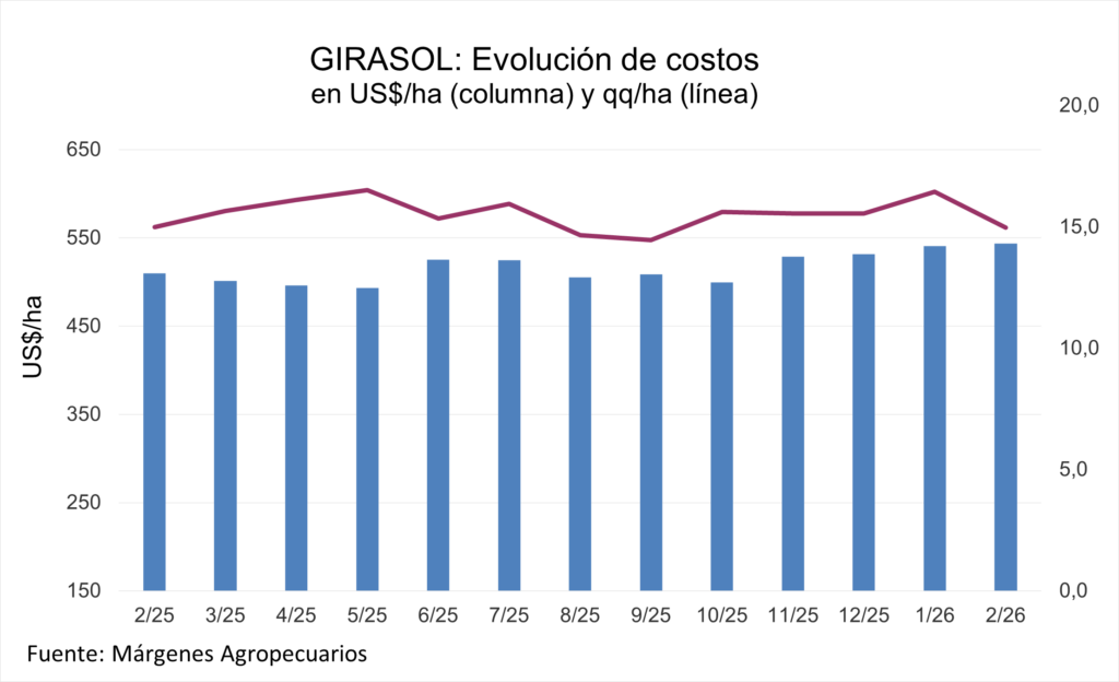 Ante una fuerte suba en los precios, que pasaron de 329 US$/tn en ene/26 (en el inicio de una excelente cosecha en el norte del país) a 363 US$/tn actuales (ante una fuerte suba en los precios internacionales del aceite de girasol) los costos expresados en quintales se estiman en 15 qq/ha, valor que sirve de referencia para compararlo con los rindes que se obtengan en cada lote, en una campaña con fuerte aumento en el área y en la producción esperada, en un cultivo que se defiende bien en situaciones de déficit hídrico.