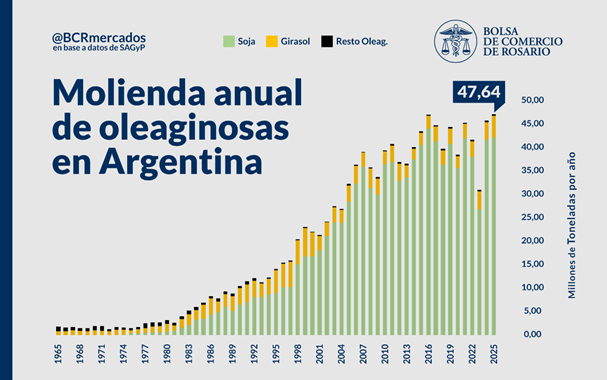A partir de entonces, se comienzan a percibir dificultades para sostener el crecimiento observado en los más de 40 años anteriores, ya que entre el año 2010 y 2020 la molienda cae entre puntas un 2%. Más allá de este estancamiento de mediano plazo y la variabilidad del total procesado, el máximo de procesamiento de oleaginosas se alcanza en 2016 con 47,55 Mt, barrera que recién se logra romper este último año 2025 con un récord de 47,64 Mt.
