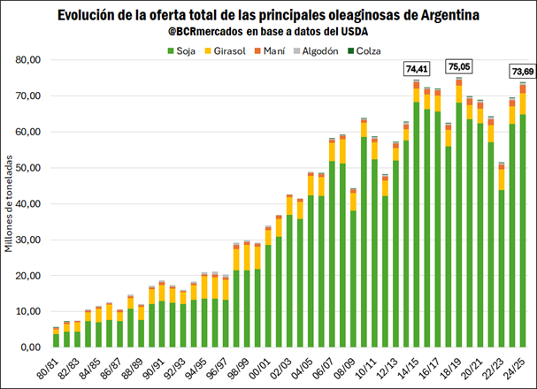 En línea con lo comentado anteriormente, este nuevo máximo histórico en la molienda en 2025 es posible gracias al buen nivel de oferta total de las principales oleaginosas producidas en Argentina.
