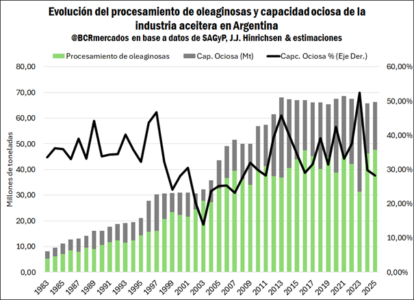 Por último, es factible comparar el nivel de procesamiento con la estimación de capacidad instalada activa. En el siguiente gráfico se puede observar que, con una molienda de 47,64 Mt de oleaginosas en 2025, se arriba a una capacidad ociosa de la industria estimada en torno al 28,2%, lo cual sería un mínimo desde el año 2011.