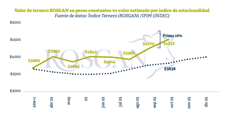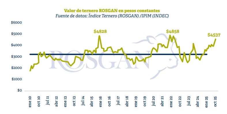 El índice de referencia para el Ternero ROSGAN alcanzó los $4.537 por kilo, lo que representa un incremento del 8,1 % frente a los valores observados en septiembre y del 47,9 % en lo que va del año. Asimismo, al analizar la serie histórica desde enero de 2010, medida en pesos constantes ajustados por inflación (IPIM), el valor actual del ternero se ubica un 40% por encima del promedio de los últimos 15 años, siendo el tercer valor más alto, solo por detrás de los máximos registrados en diciembre de 2015 y diciembre de 2021, dos períodos marcados por una fuerte inestabilidad política y cambiaria.