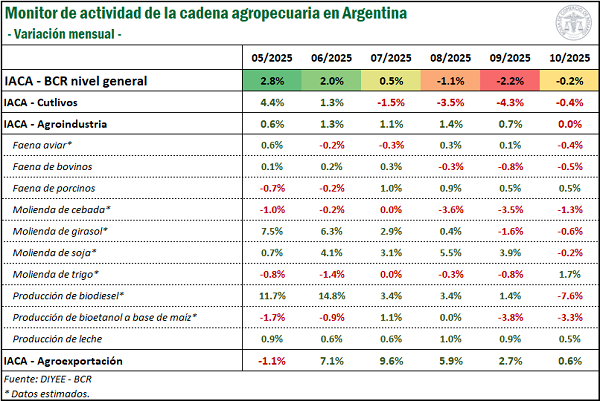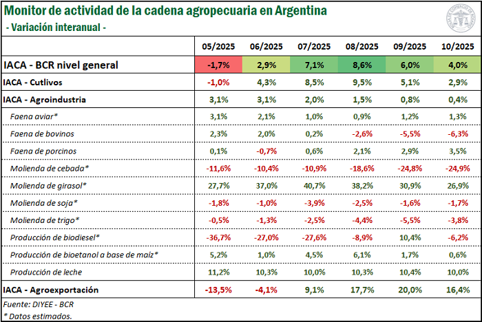 En el mes de octubre, el Índice de Actividad de la Cadena Agropecuaria (IACA-BCR) que estima la Bolsa de Comercio de Rosario se ubica un 4% por encima del nivel de octubre del año pasado, aunque registra una leve disminución del 0,2% respecto a septiembre por la caída momentánea en el avance en la superficie que se siembra con soja. En lo que va del 2025, la recuperación de la actividad de la cadena agropecuaria alcanza el 1,7%, midiendo puntualmente enero con octubre del 2025.