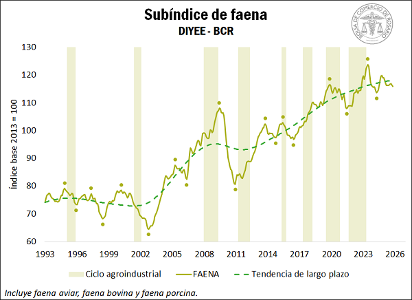 Por su parte, el subíndice de faena mostró una leve retracción del 0,3% durante octubre, principalmente por la caída desestacionalizada observada en la faena de bovinos. Esta baja responde a una oferta restringida y a una mayor permanencia de la hacienda a campo, favorecida por las excelentes condiciones de las pasturas primaverales en gran parte de las regiones ganaderas. Con buena provisión de forraje y en un contexto de precios en suba, disminuyen los incentivos a apurar la salida a faena. Sumado a ello, en las regiones donde las lluvias resultaron excesivas, limitaron la disponibilidad de ganado para comercializar, incluyendo la imposibilidad de sacar terneros en zonas inundadas.
