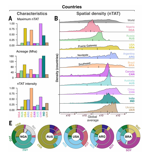 Figura 1. (A) Intensidad máxima de toxicidad aplicada en los 10 países con mayor superficie agrícola. (B) Cómo se distribuye espacialmente dentro de esos países.(E) Peso de cada cultivo en la toxicidad total nacional y en la superficie sembrada de los países con mayor TAT. En todos los gráficos, Argentina aparece en celeste. Fuente: Wolfram et al. (2026).