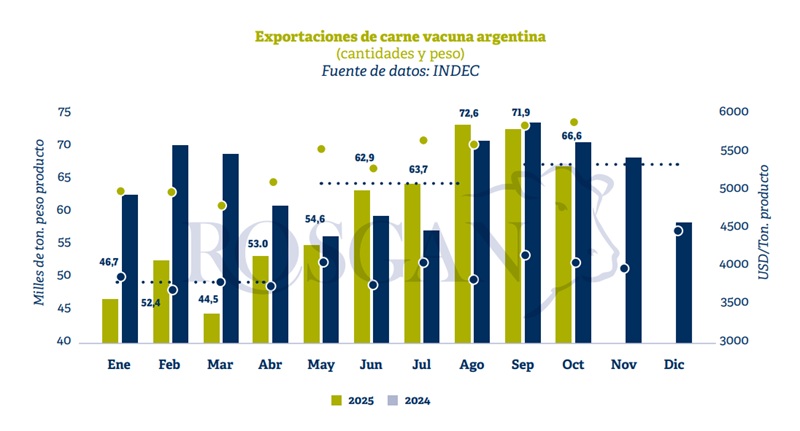 Según los datos del INDEC, en lo que va del año y hasta octubre las exportaciones de carne vacuna—sin descontar la exportación de huesos— se ubicaron en torno a 588.800 toneladas, por un valor aproximado de USD 3.155,1 millones.