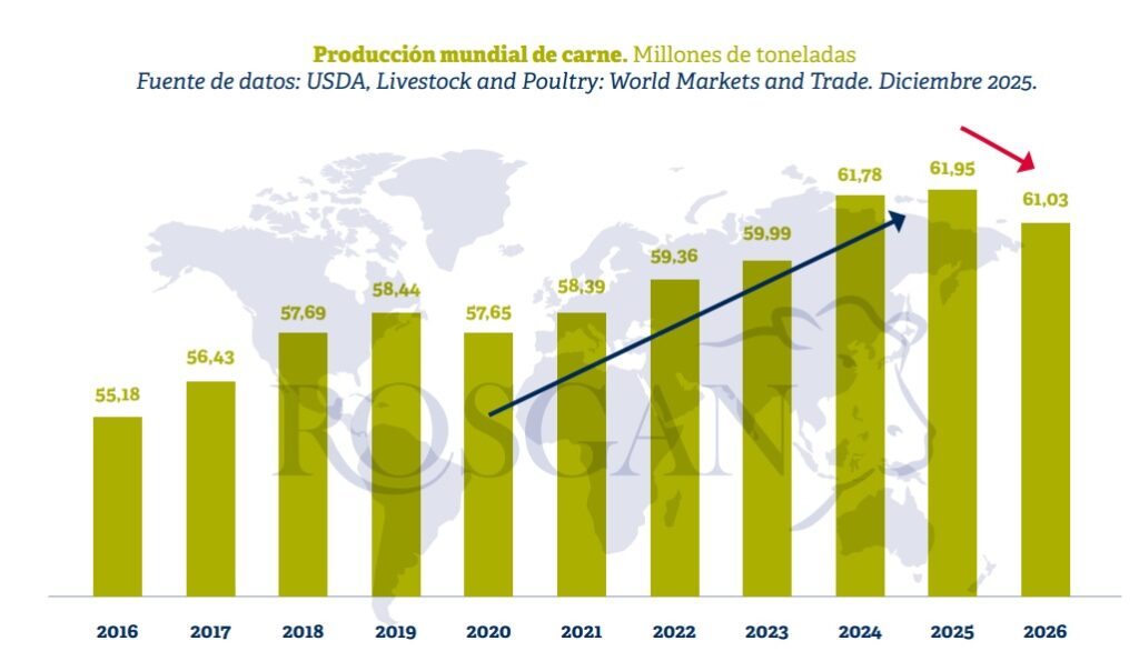 Sin embargo, de manera sorpresiva, al momento de publicarse este informe —y tras varias semanas de retraso en su difusión debido al cierre temporal de los servicios oficiales— el USDA finalmente dio a conocer sus proyecciones sobre producción y comercio mundial de carnes para el próximo ciclo, confirmando la caída anticipada. Este ajuste resulta particularmente relevante, ya que marca el fin de un prolongado período de crecimiento de la producción global registrado durante los últimos cinco años.