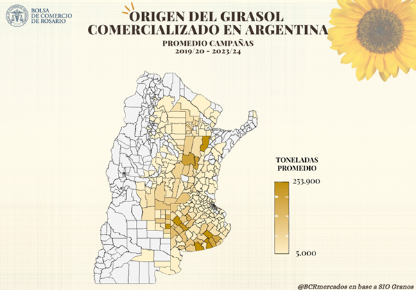 Se estima que, en promedio, se comercializaron 3,4 Mt de girasol por ciclo comercial durante las últimas cinco campañas, en línea con una producción promedio de 3,7 Mt. Más del 85% de la mercadería comercializada en el país se origina en tres provincias: Buenos Aires (60%), Santa Fe (15%) y La Pampa (11%). Dentro de estas tres provincias, la originación no resulta uniforme en todo el territorio, sino que, lógicamente, se encuentra ligada a las zonas de mayor producción del cultivo. En Buenos Aires, sobresalen los partidos del sur, como Tandil, Necochea y Tres Arroyos, y del oeste, como Trenque Lauquen y Daireaux; en Santa Fe, predominan los departamentos del norte, principalmente General Obligado, San Justo y San Cristóbal; mientras que, en La Pampa, toman relevancia los partidos del noreste, como Catriló, Maracó y Conhelo.