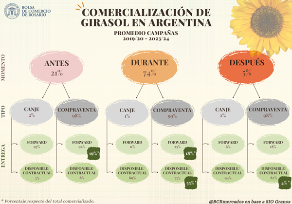 En promedio, el 55% del girasol se comercializa durante la compaña comercial, con contratos de compraventa y con entrega disponible/contractual. La segunda modalidad más utilizada es la mercadería negociada en precosecha, con contratos de compraventa y entrega diferida (19%). Le siguen, en orden decreciente de importancia, las operaciones de girasol durante la campaña, bajo contratos de compraventa y con entrega forward (18%), y la mercadería negociada una vez finalizada la campaña, bajo contratos de compraventa y con entrega disponible/contractual (4%).