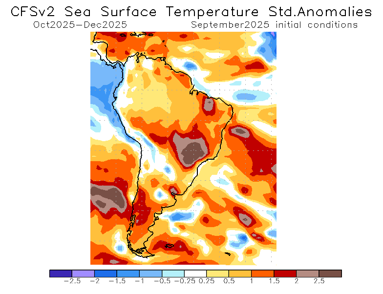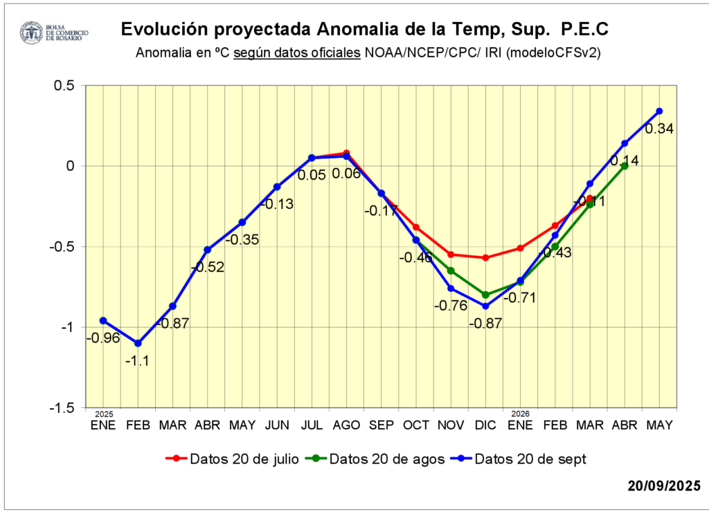 Con la siembra maicera en Argentina en marcha, peleando contra los excesos y buscando llegar a los lotes entre las tormentas que han ganado frecuencia semanal, la NOAA muestra una anomalía de la SST (temperatura superficial del mar) con un actual valor (setiembre) de -0,4, o sea casi saliendo de Neutralidad. La diferencia respecto a un mes atrás, es que la evolución proyectada de la anomalía en el mes de setiembre versus lo proyectado en agosto muestra valores de enfriamiento levemente mayores por debajo del umbral de -0,5. En agosto el valor más bajo se preveía en -0,8 para diciembre. Ahora, en setiembre, se observa un valor de -0,87. Este mayor enfriamiento también se nota en noviembre: -0,76 (vs -0.65). Pero no para enero: -0,71  ahora contra -0,72 hace un mes. ¿Qué significan estos números? Primero, que se ratifican valores de una probable Niña de intensidad leve y corta duración. Lo segundo es que “el rebote”, la vuelta a Neutralidad, se estaría acelerando y dando antes de que termine enero 2026. De hecho, para febrero 2026 se proyecta un valor de -0,43 (vs -0,5 proyectado en agosto). Entre los meses de enero y mayo del 2026 se hace evidente un calentamiento muy sostenido que invita a preguntarse si no es un “Niño” lo próximo que puede estar caracterizando a la fase del Pacífico.