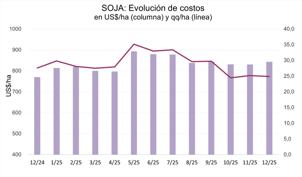 Los costos totales directos e indirectos (sin computar el Impuesto a las Ganancias) de acuerdo a un planteo representativo elaborado por Márgenes Agropecuarios se estiman en 843 US$/ha en dic/25, levemente por encima de 830 US$/ha de nov/25.