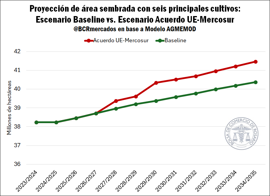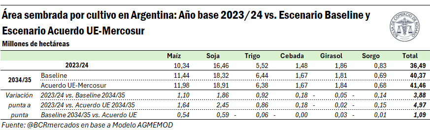 La siguiente tabla resume cómo quedaría compuesta el área bajo el escenario del acuerdo en la campaña 2034/35. Se sembrarían 41,46 millones de hectáreas con los seis principales cultivos, superando en casi 5 M ha a la campaña 2023/24. La distribución sería de 18,9 M ha de soja; 12,0 M ha de maíz; 6,4 M ha de trigo; 1,8 M ha de girasol; 1,7 M ha de cebada y 0,7 M ha de sorgo.