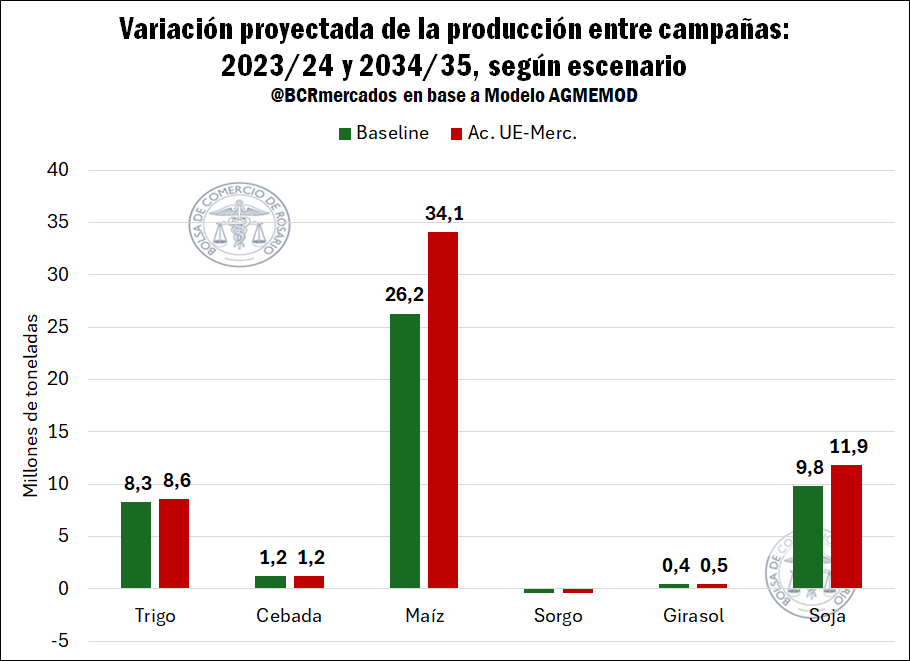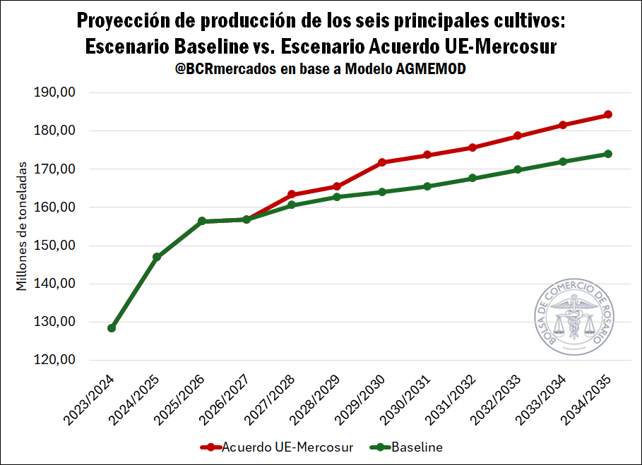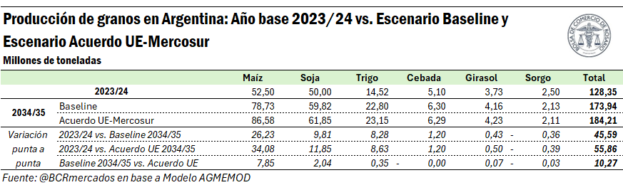 Bajo los supuestos abordados, el Acuerdo UE-MERCOSUR permitiría a nuestro país alcanzar en el ciclo 2034/35 una producción de 184,2 millones de toneladas entre los seis principales cultivos (soja, maíz, trigo, sorgo, cebada y girasol), lo que supera en 10,2 millones de toneladas a la producción que se hubiese alcanzado en dicha campaña en el escenario base. Esta producción estaría compuesta por 86,6 Mt de maíz, 61,9 Mt de soja, 23,2 Mt de trigo, 6,3 Mt de cebada, 4,3 Mt de girasol y 2,1 Mt de sorgo.