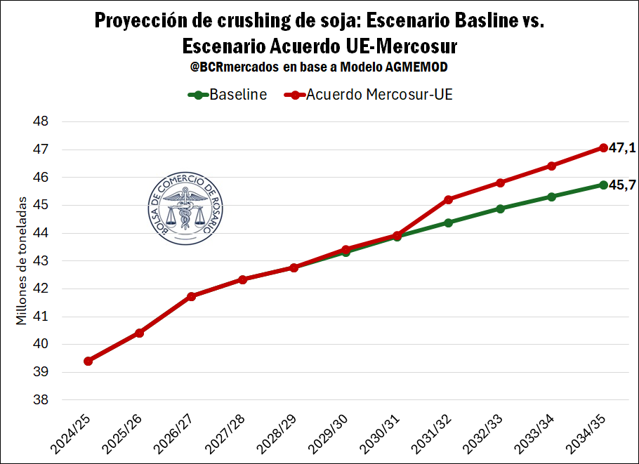 En total, con el Acuerdo UE-Mercosur para la campaña 2034/35 los embarques de los seis principales complejos agrícolas ascenderían a 125,8 Mt, superando en 7,5 Mt los 118,3 Mt que se proyectaban exportar en el escenario base.