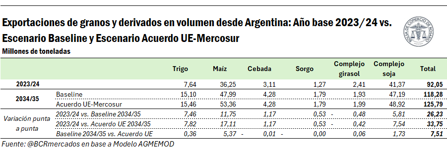 En cuanto a las exportaciones totales, e incluyendo aquí los despachos a todos los destinos, hacia la campaña 2034/35 bajo el escenario alícuotas fijadas por el acuerdo, las exportaciones de poroto de soja, harina, aceite y biodiesel podrían sumar 48,9 millones de toneladas en dicha campaña (contra 47,2 Mt en el escenario base sin acuerdo). En tanto, con el acuerdo, los despachos de maíz sumarían 53,3 Mt (vs. 48,0 Mt), los de trigo 15,5 Mt (vs. 15,1 Mt), los de cebada 4,3 Mt (vs 4,3 Mt), los del complejo girasol 2 Mt (vs 1,9 Mt) y los de sorgo 1,8 Mt (vs 1,8 Mt).