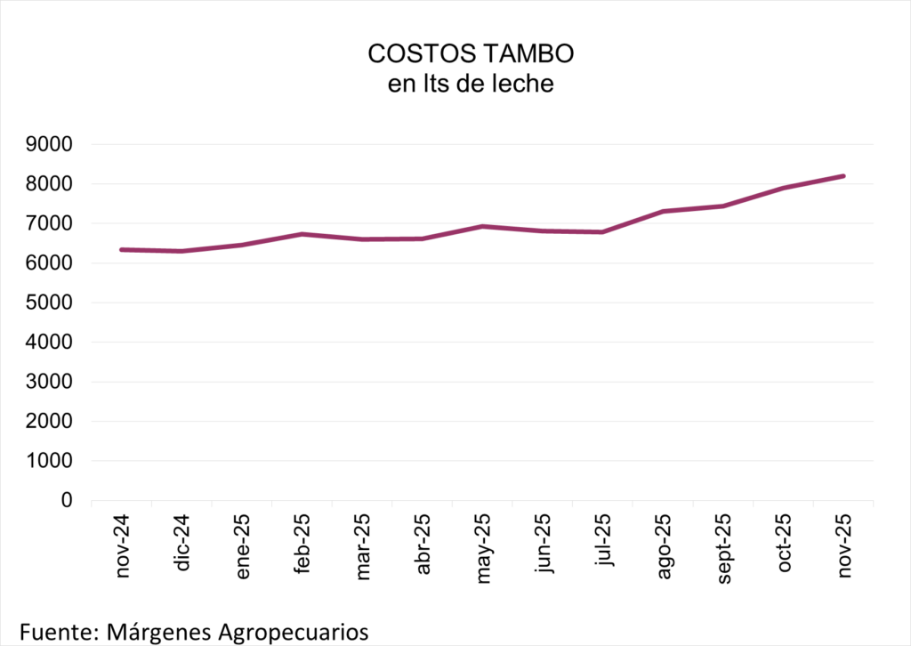 En vista de que el precio de la leche bajó en dólares, los costos totales expresados en litros de leche aumentaron de 7.897 a 8.201 lt/ha. Este es el valor más alto en litros desde ene/24 (post devaluación de dic/23), en que la leche cotizaba a 0,29 US$/lt. y que luego de sucesivos aumentos llegó a máximos de 0,42 US$/lt entre jul y dic/24.