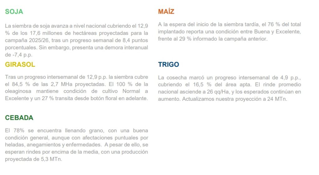 Luego de un progreso intersemanal de 8,4 p.p., la siembra de soja a nivel nacional cubre el 12,9 % de las 17,6 MHa proyectadas para la campaña 2025/26. Se registra una demora interanual de -7.4 p.p. y de -3 p.p. respecto al promedio de las últimas cinco campañas.