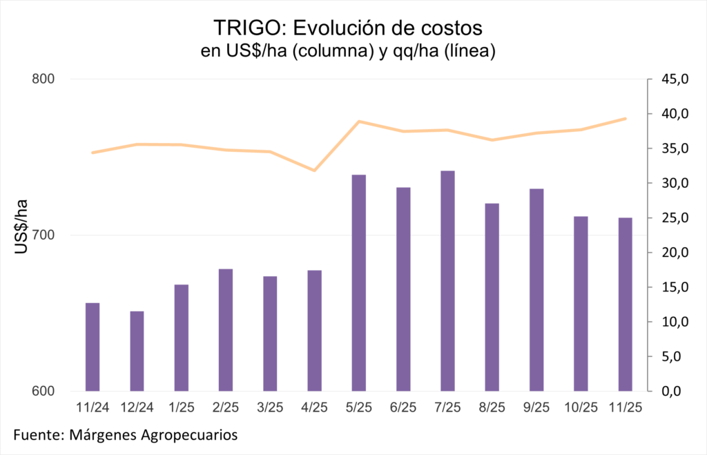 Ante un precio disponible que bajó de 189 a 181 US$/tn, los costos totales expresados en quintales pasaron de 37,7 qq/ha en oct/25 a 39,3 qq/ha en nov/25. Ante precios para el trigo relativamente bajos, la campaña, que avanza muy bien en lo productivo, se definirá con rindes.