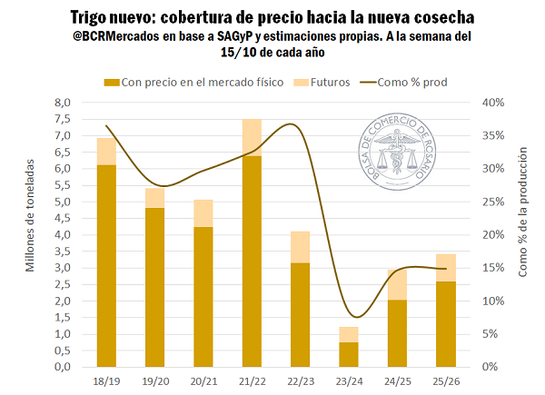 Sin embargo, la cobertura de precios se ha rezagado respecto a las campañas anteriores. A la semana del 15/10 se comprometieron 4,7 Mt de trigo, de las cuales solo 2,6 Mt tienen precio firme. Si tenemos en cuenta el interés abierto en el mercado de futuros, la cobertura de precio para la 2025/26 está en un 15% de la cosecha esperada, la mitad de la proporción promedio para esta altura del año.