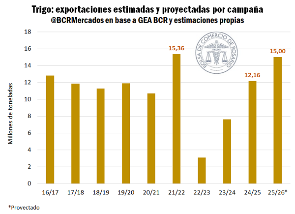 En Australia, las estimaciones oficiales para la 2025/26 rondan las 34 Mt y ya está entrando en cosecha. En Argentina, las proyecciones récord estarían dejando una oferta total por encima de las 26 Mt que permitirían un horizonte exportador de 15 millones de toneladas, y con posibilidades aún de igualar o superar el récord de 15,4 Mt de la campaña 2021/22.