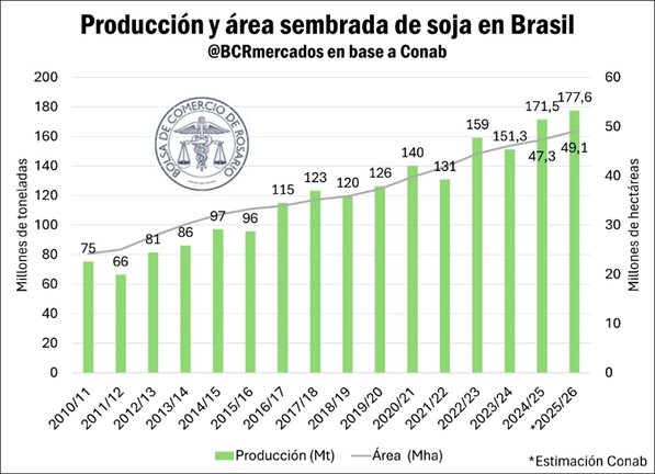 Entrados en la etapa de siembra de Brasil, la CONAB publicó las primeras estimaciones de producción de soja para la campaña 2025/26. Las proyecciones muestran un escenario optimista, indicando que el país vecino alcanzaría una nueva cosecha récord de la oleaginosa. Este dato acompaña una tendencia que ya era creciente, a tal punto de que se superaría a la cosecha actual, que ya marcaba un récord histórico. De acuerdo con esta primera previsión, la producción podría alcanzar 177,6 millones de toneladas. Este guarismo representa un crecimiento de 3,6% respecto a la campaña actual y se ubica un 18% por encima del promedio de los últimos 5 años.
