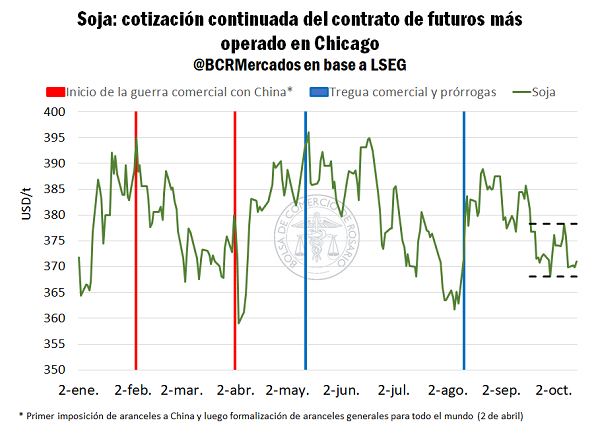 Entre fines de la semana pasada y esta semana hemos asistido a un nuevo episodio de la novela entre Estados Unidos y China. El viernes 10 de octubre, el presidente Donald Trump posteó en su red social “Truth Social” una publicación con tono hostil hacia los asiáticos, amenazando con la imposición de aranceles adicionales del 100% a la importación de cualquier producto chino hacia Norteamérica, a partir del 1 de noviembre, en respuesta al significativo aumento del control a las exportaciones de “tierras raras” por parte del gigante asiático. Tan solo dos días después, Trump volvió a publicar con relación al tema, esta vez tratando de traer tranquilidad: “no hay nada de qué preocuparse, todo estará bien con respecto a China! Respeto profundamente al presidente Xi”. Sin embargo, el 14 de octubre, mediante una nueva publicación y esta vez tocando directamente el tema de la soja y la ausencia de compras chinas, acusó a los asiáticos de evitar comprar los porotos norteamericanos como parte de su estrategia para las negociaciones bilaterales actuales.