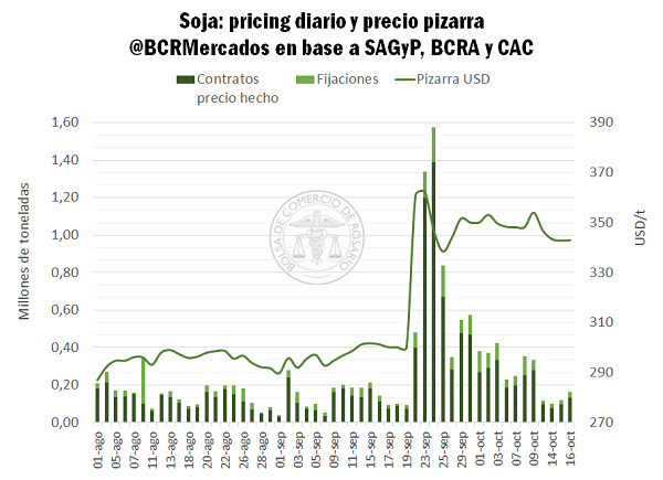 Esta semana el nivel de comercialización se resintió fuertemente. Según el Monitor de Comercio Granario de SAGyP, entre el 13 y 16 de octubre el promedio diario fue de tan solo 110.000 toneladas operadas, una tercera parte del promedio diario posterior a la suspensión temporaria de derechos de exportación. En la misma sintonía, el pricing de granos fue prácticamente inexistente. Desde el 24 de septiembre, en promedio se fijaban 100.000 toneladas de soja cada día hábil, esta semana, con suerte se superaron las 20.000 toneladas. A demás, los contratos con precio hecho pasaron de promediar por encima de las 300.000 toneladas, a solo una vez alcanzar las 100.000. El aumento en la volatilidad cambiaria y la expectativa en torno a la cumbre Trump – Milei marcó el ritmo de la operatoria interna.