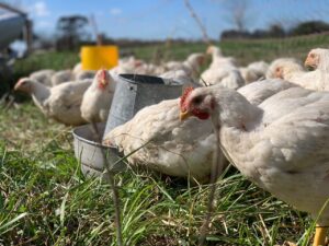 Para la producción de pollo usan la misma raza comercial que la industria, sin embargo aseguran que “el hecho de que estén al sol, coman pasto y tengan a disposición los bichitos, cambia las propiedades organolépticas del producto”. Por ello valoran el “pensar qué es lo que comen esos animales para repensar que somos lo que comemos”.