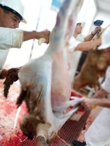 La faena se realiza bajo estrictos controles sanitarios y bromatológicos, garantizando que la carne esté en óptimas condiciones para su comercialización en carnicerías de la zona.