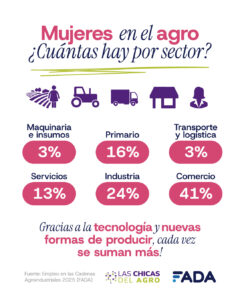 La inclusión de las mujeres en todas las actividades de la agroindustria ya no es una ilusión, es una realidad que está marcando un cambio de paradigma que llegó para quedarse. Y así lo demuestran los datos del primer informe: “Mujeres en la agroindustria: construyendo futuro”, realizado por FADA (Fundación Agropecuaria para el Desarrollo de Argentina) en conjunto con la Asociación Civil Las Chicas del Agro: “El agro genera 4,2 millones de trabajo en todo el país, de los cuales 1,2 millones son realizados por mujeres” detalla Antonella Semadeni, economista de FADA.